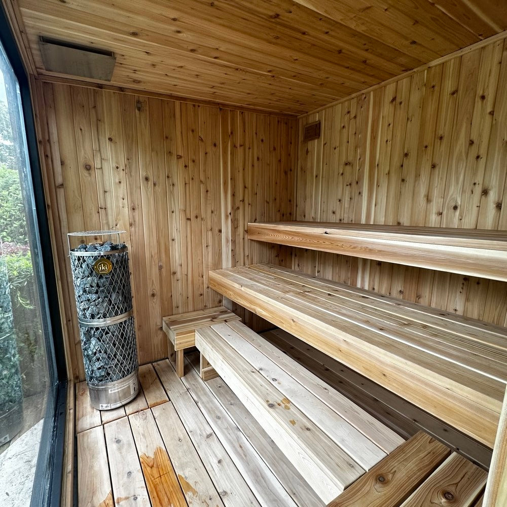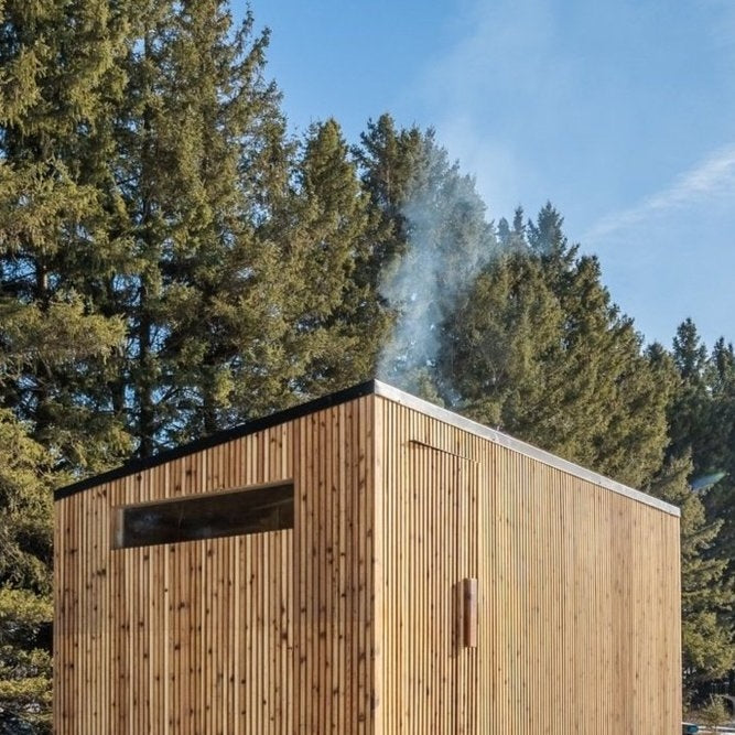Reconnect with nature in our 7’x 7’ Northman Sauna. Its expansive picture window allows you to truly take in the beauty of your landscape. Once inside, hear the crackle from the wood heater or hiss from the rocks as you throw a ladle full of water on an electric IKI.